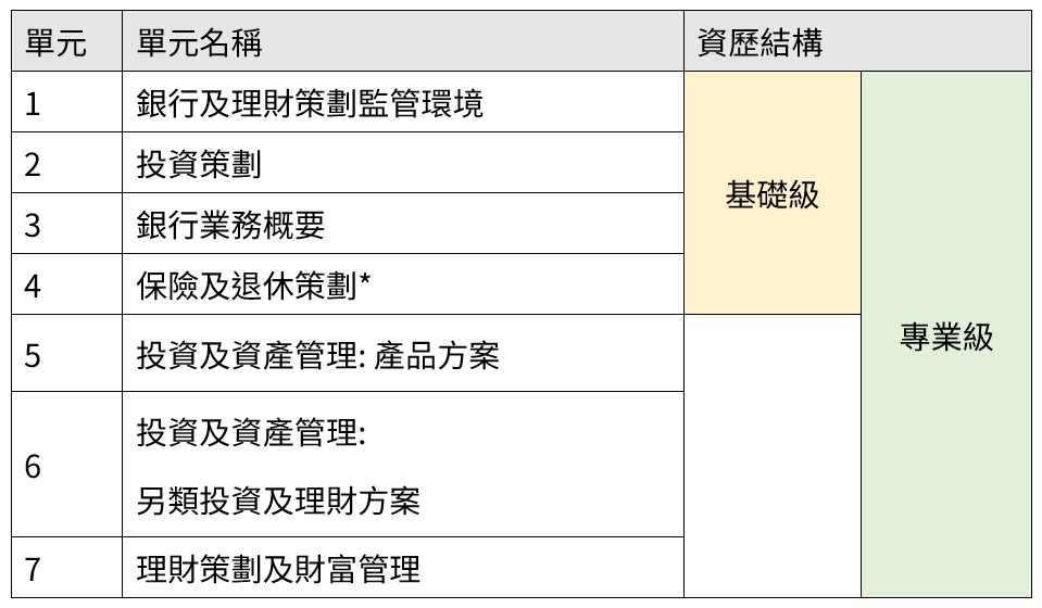 *單元四:不設課堂及考試,學員必須申請豁免單元四。豁免申請資格為成功考保險中介人資格考試 (IIQE)卷 一、卷二 和 卷三。