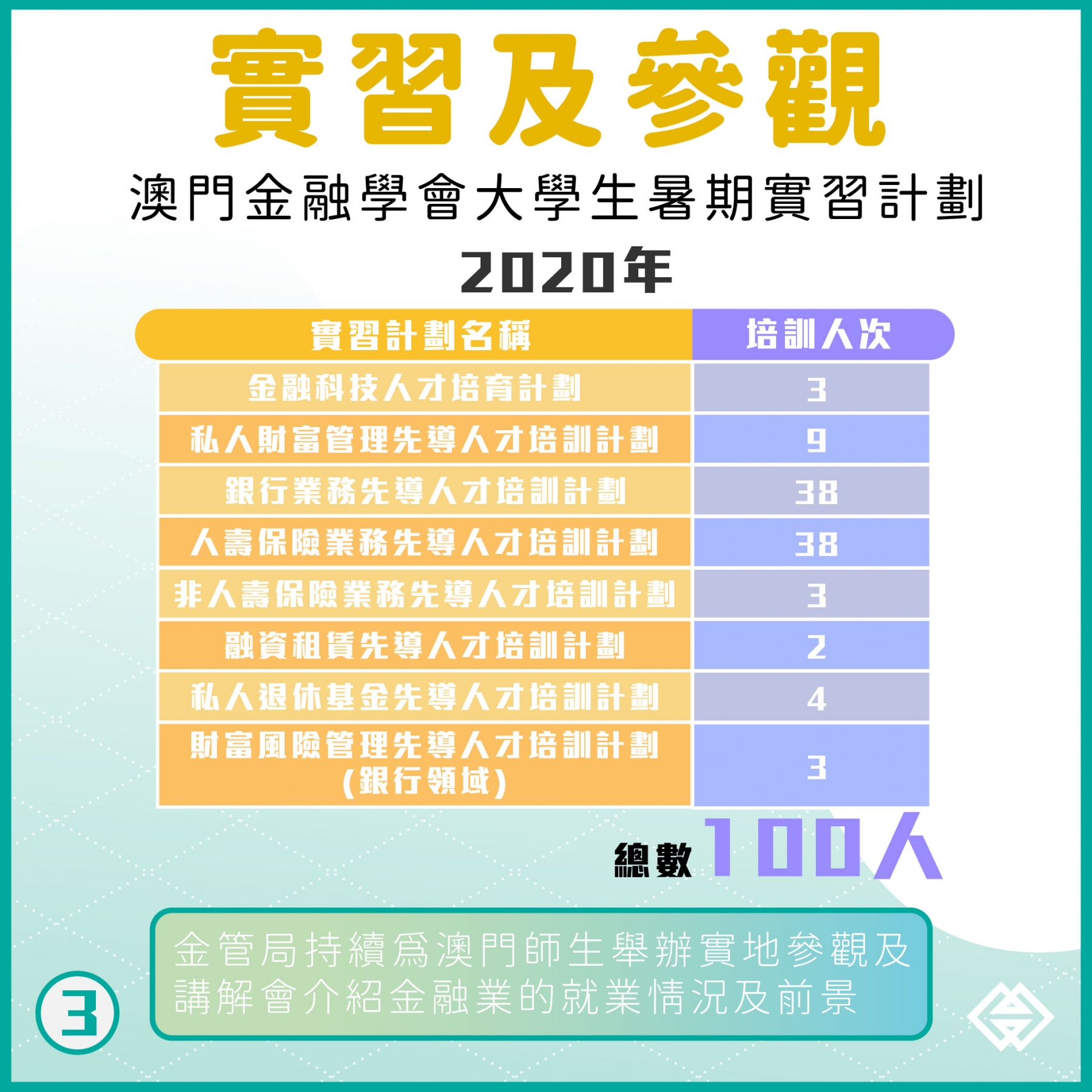 自2018年起,澳門金融學會並組織大學生到金融機構實習,2020年增設了金融科技、融資租賃等範疇的實習職位,約有100名學生參加。此外,金管局持續為澳門師生舉辦實地參觀及講解會等活動,介紹金融業的就業情況及前景,輔助有意投身金融行業的青年及早做好職涯規劃。